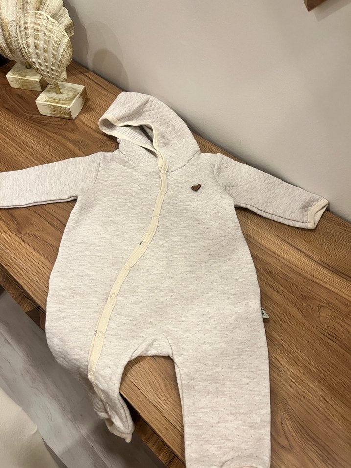 Gri renkte, yumuşak ve sıcak kumaştan yapılmış, düğmeli önüyle kolay giyilen kapüşonlu bebek tulumu. Normcore tarzda.