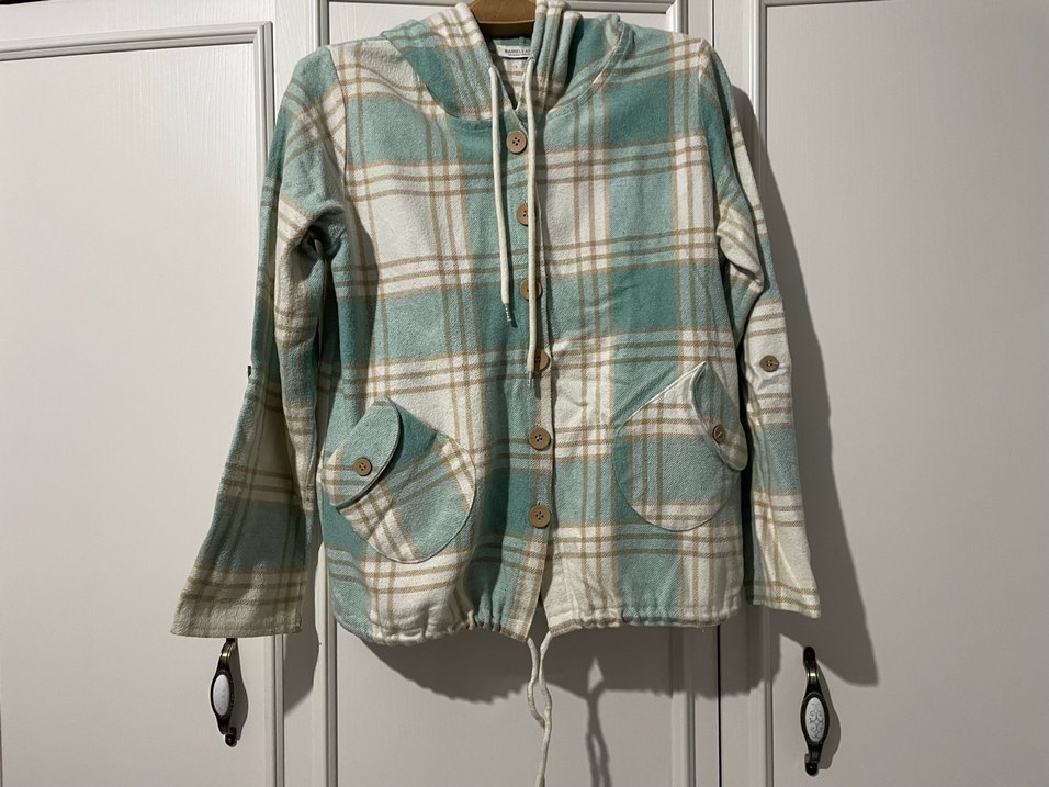 Kapüşonlu, düğmeli ve iki cepli, bol kesim uzun kollu gömlek. Yumuşak ve rahat kumaştan, pastel bej ve yeşil ekose desenli. Günlük kullanım için uygundur.