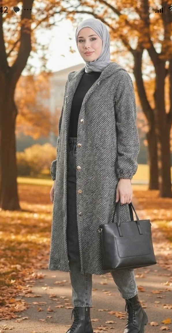 Uzun boylu gri yün kaban, zebra desenli ve düğmeli. Notch yaka ve uzun kollu, rahat kesimle sokak stiline uygun.