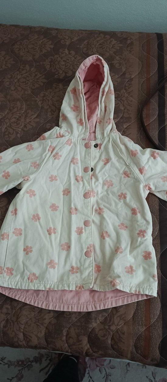 Kapüşonlu ve düğmeli, bol kesim kız çocuk montu. Yumuşak ve sıcak kumaştan, pastel beyaz zemin üzerinde çiçek desenleriyle sokak stiline uygun. çift taraflıdır. pembe olan tarafında çamaşır suyu lekesi var