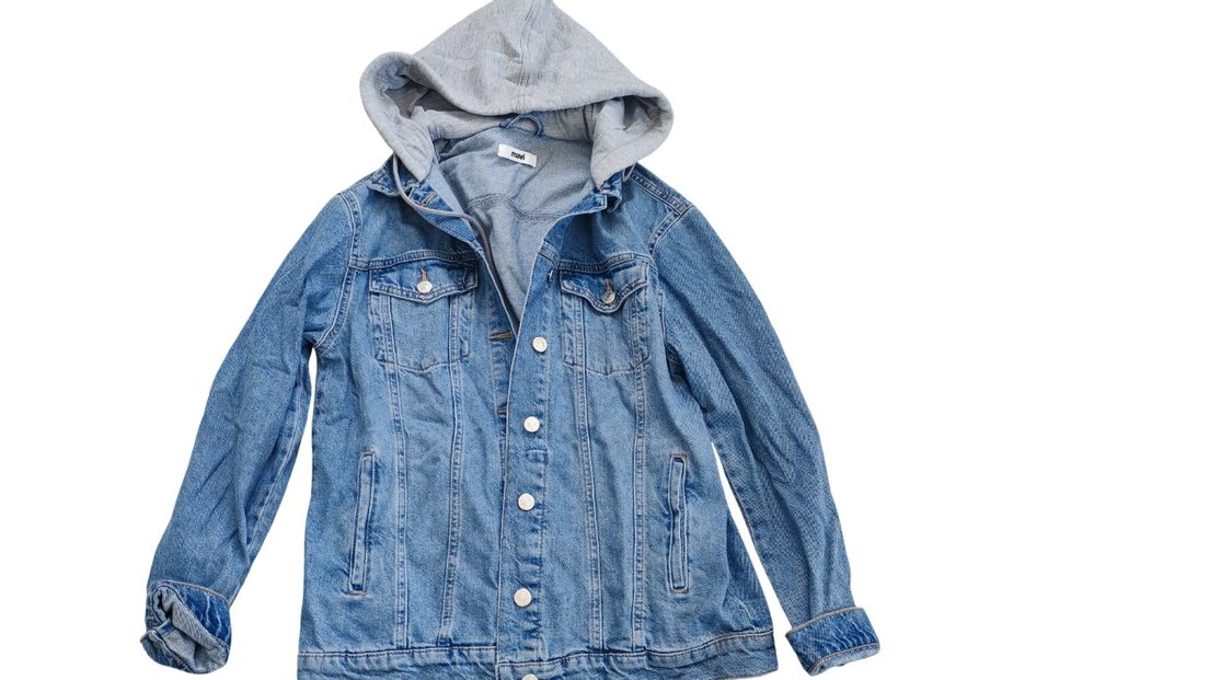 Gri kapüşonlu, düğmeli, bol kesim mavi denim ceket. Uzun kollu ve normal boyda, günlük sokak stili için uygundur.