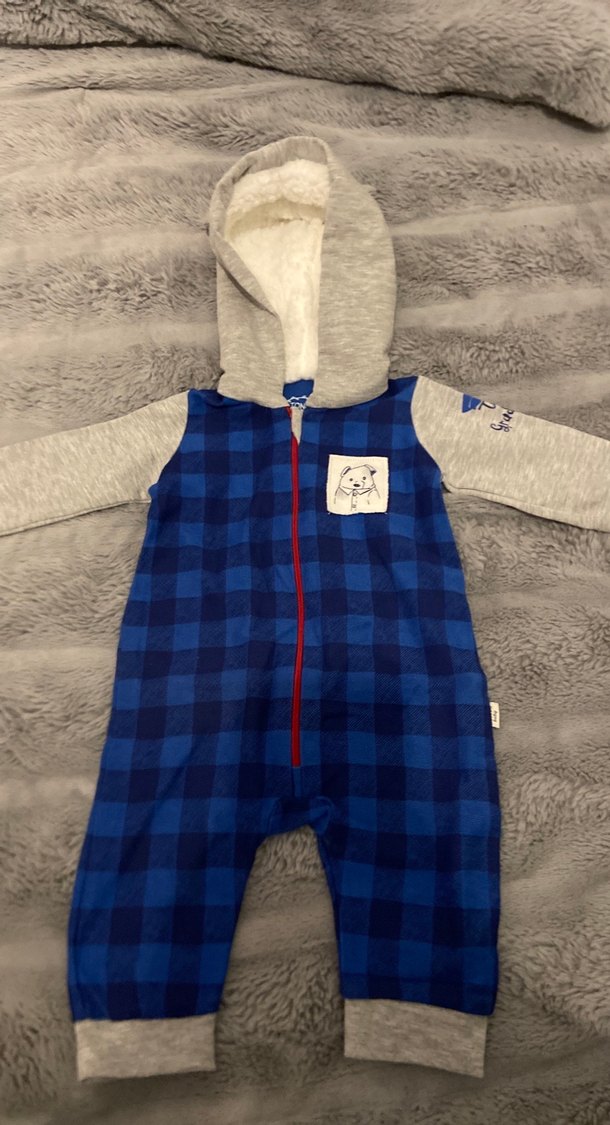 Kapüşonlu, fermuarlı, mavi ve gri ekose desenli bebek tulumu, rahat ve şık sokak stili sunar. ❄️