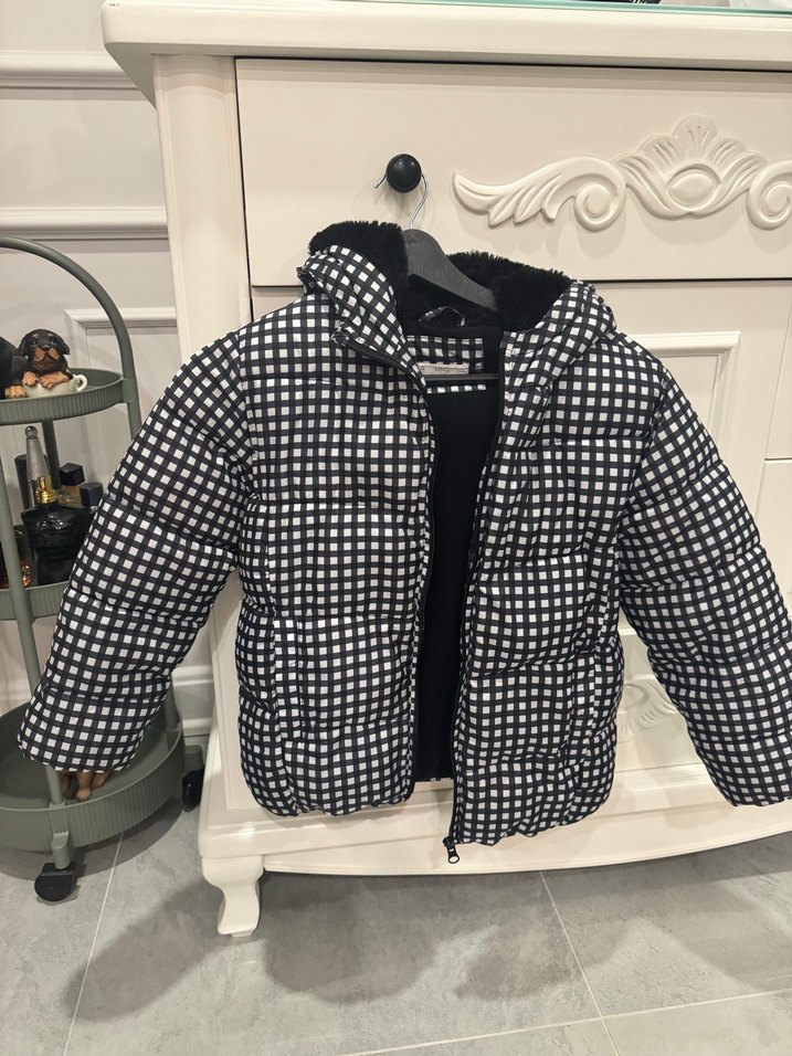 Kapüşonlu, fermuarlı ve ekose desenli çocuk montu, yumuşak ve sıcak kumaştan üretilmiştir.