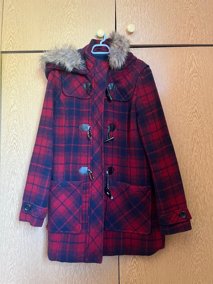 Kapüşonlu, kürklü yakalı ve kırmızı-siyah ekose desenli kaban. Önde cepler ve tokalı düğmeler bulunur.