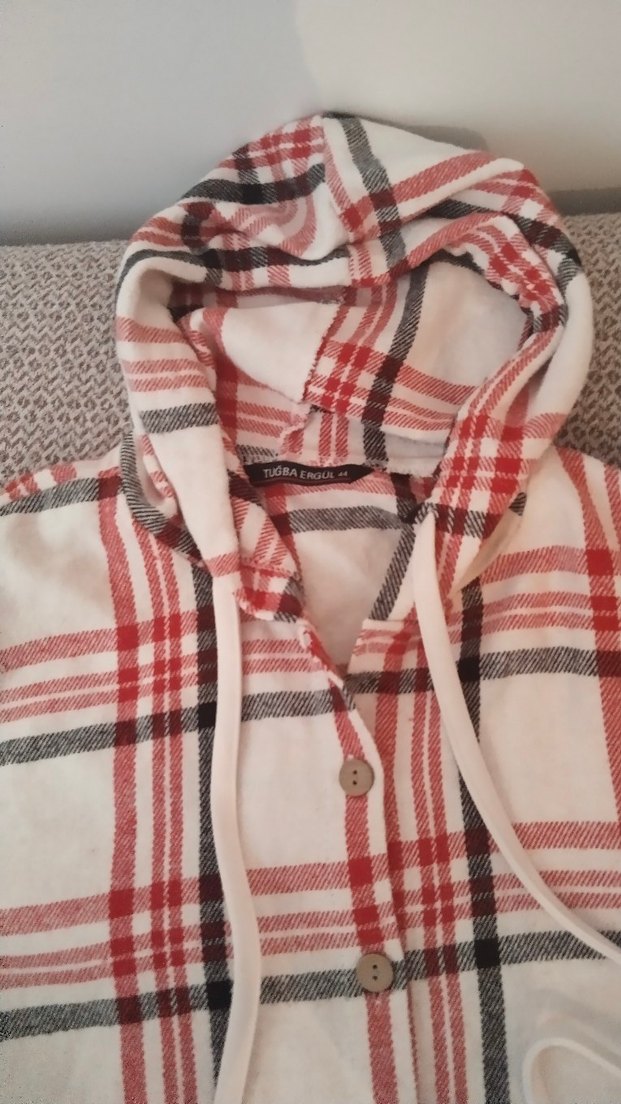Kapüşonlu, düğmeli ve uzun kollu kadın gömlek, kırmızı ve gri ekose desenli. Rahat sentetik kumaştan, salaş kesim ve günlük kullanım için uygun. defosu yoktur canlıdır renkleri soluk değildir