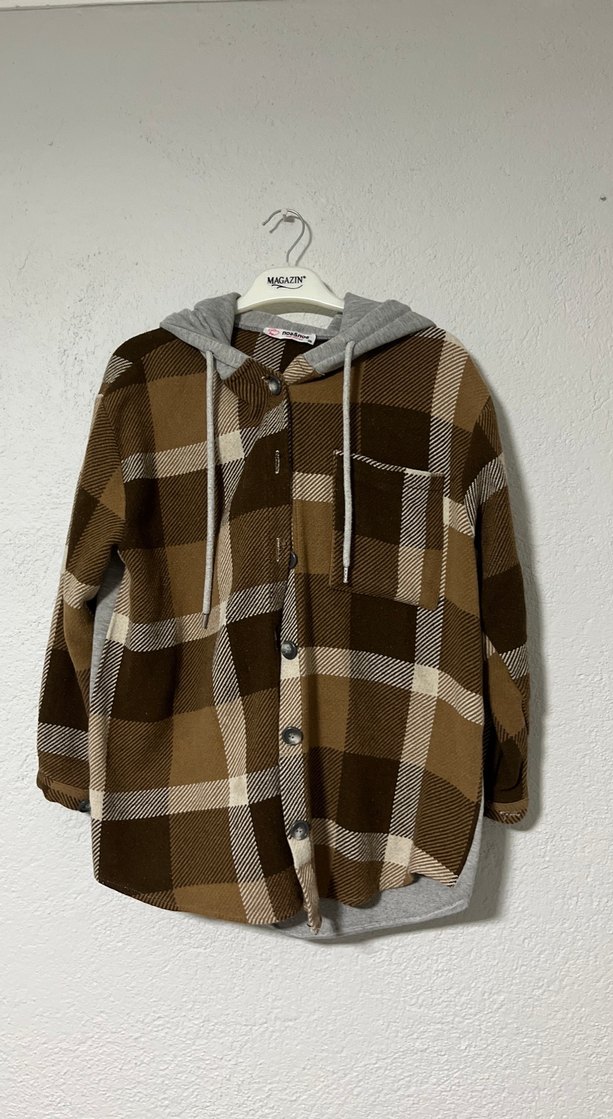 Kapüşonlu, düğmeli kahverengi ekose desenli, bol kesim uzun kollu gömlek. Yumuşak ve sıcak kumaştan üretilmiştir, rahat sokak stiline uygundur.