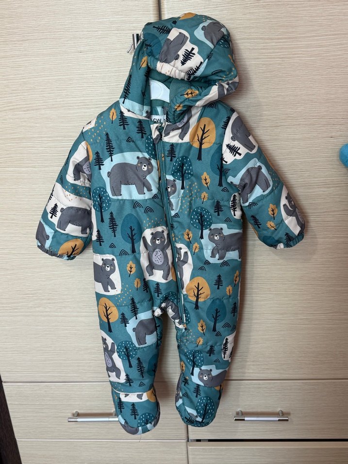 Kapüşonlu, fermuarlı ve yumuşak kumaştan yapılmış, ayı ve ağaç desenli gri erkek bebek tulumu. Yırtık ve leke yok
