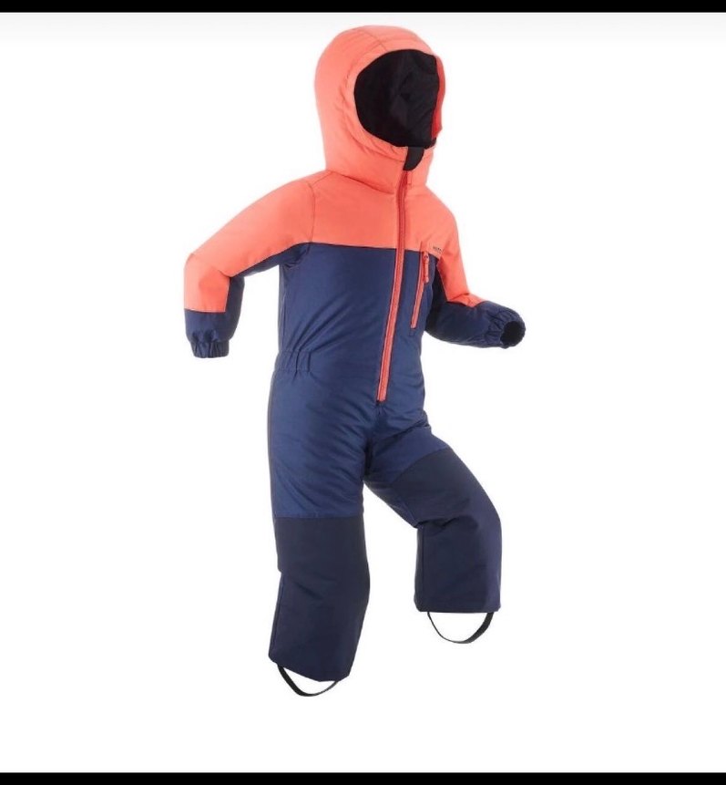 Kapüşonlu ve cırt cırtlı, yumuşak ve sıcak kumaştan yapılmış erkek bebek kayak tulumu. Koyu mavi ve mercan renkleri sokak stilinde birleşiyor. ❄️