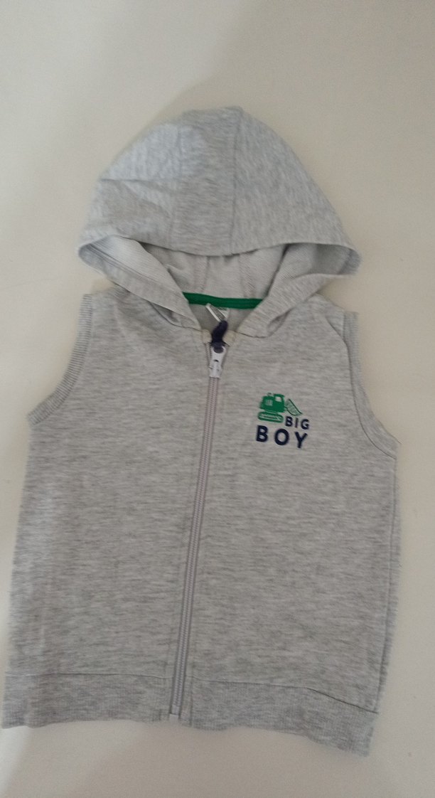 Kapüşonlu, fermuarlı ve baskılı gri erkek çocuk yeleği. Yumuşak ve sıcak kumaştan, dar kesim ve sokak tarzında.