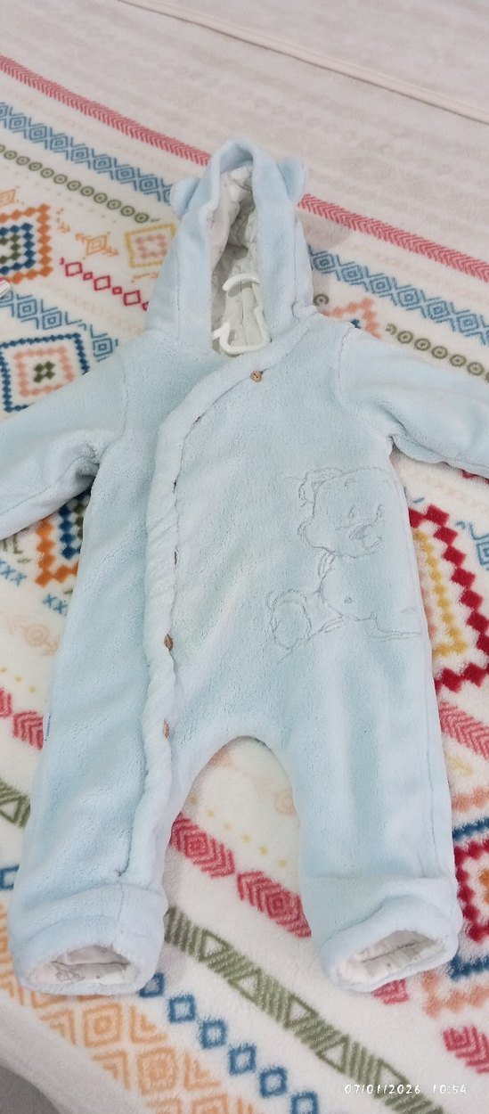 Kapüşonlu, yumuşak ve sıcak kumaşlı mavi erkek bebek tulumu, kürk detaylı ve nakışlı desenlidir. bir sorunu yok❄️