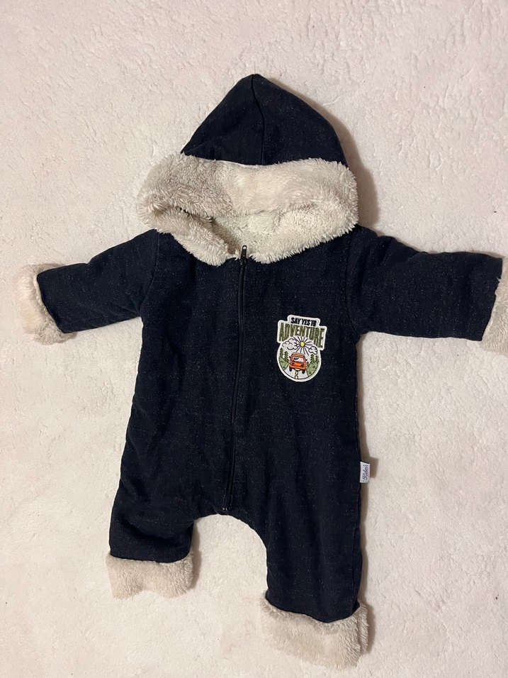 Kapüşonlu, ön fermuarlı, yumuşak ve sıcak kumaştan yapılmış koyu gri erkek bebek tulumu. Kapüşon ve manşetlerde kürk detaylı, baskılı desenli. 6 M