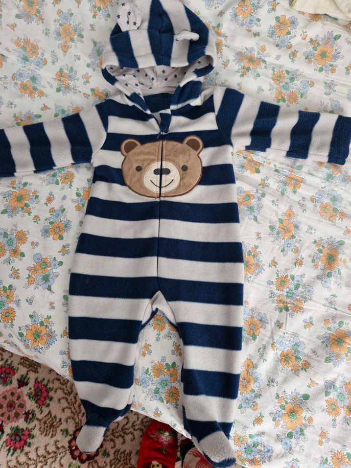 Kapüşonlu, örgü kumaştan yapılmış, renkli mavi-beyaz çizgili erkek bebek tulumu. Önünde sevimli ayıcık baskısı ve kulaklı kapüşon bulunur.