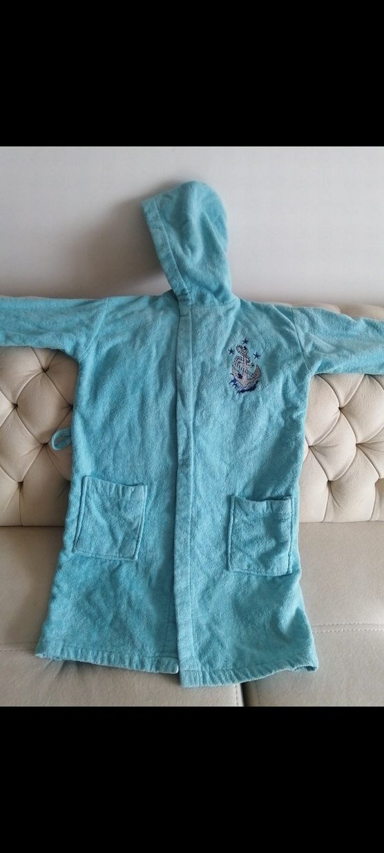 Kapüşonlu, cepli ve göğsünde baskılı desen bulunan açık mavi erkek çocuk bornozu. Yumuşak ve emici kumaştan üretilmiştir. göğüs 45 cm .bel 45 cm.boy 75 cm.kusagi yoktur.