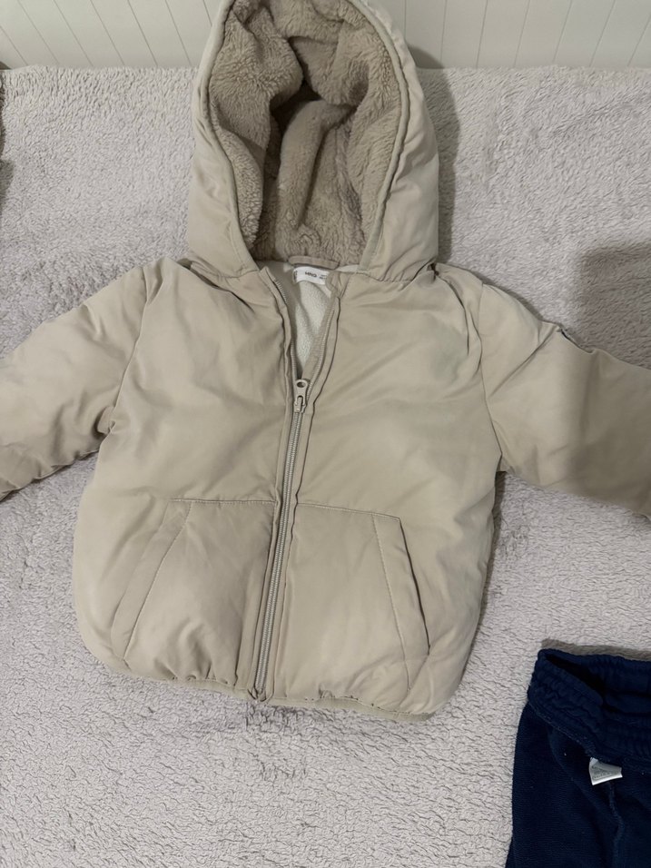 Kapüşonlu, kürklü detaylı, bej renkli erkek çocuk montu.