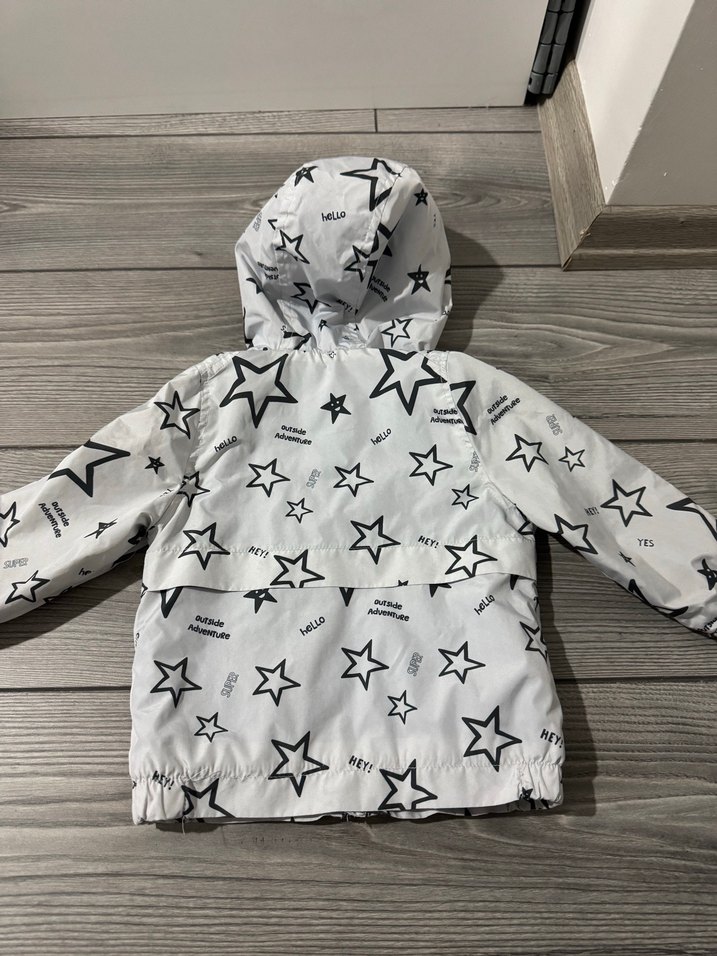 Kapüşonlu ve cırt cırtlı, sentetik kumaştan yapılmış, beyaz zemin üzerine siyah yıldız baskılı bol kesim erkek çocuk yağmurluğu. Trendy ve rahat stil sunar. ☔