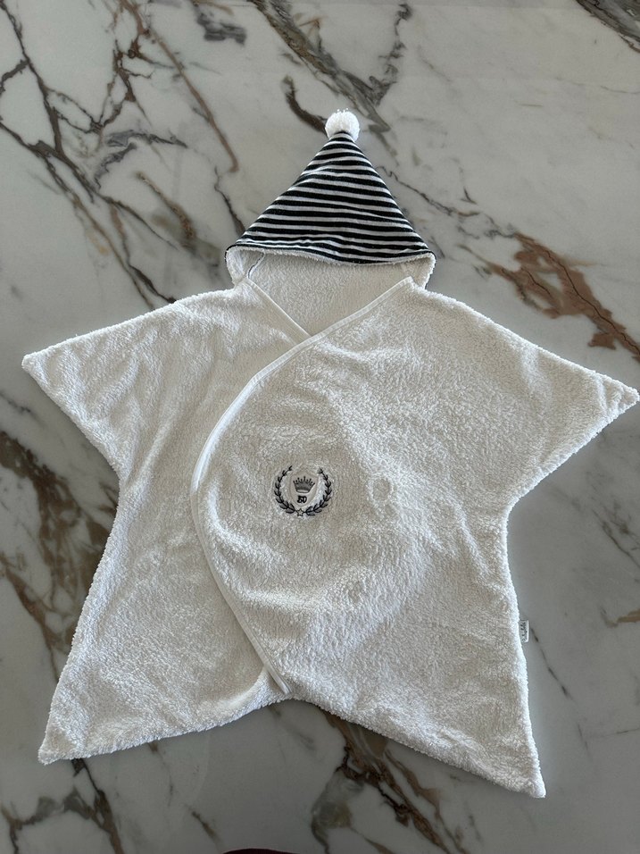 Beyaz renkli, nakış detaylı erkek çocuk bornozu, kapüşonunda gri-beyaz çizgili detaylar ve yumuşak, emici kumaş bulunur.