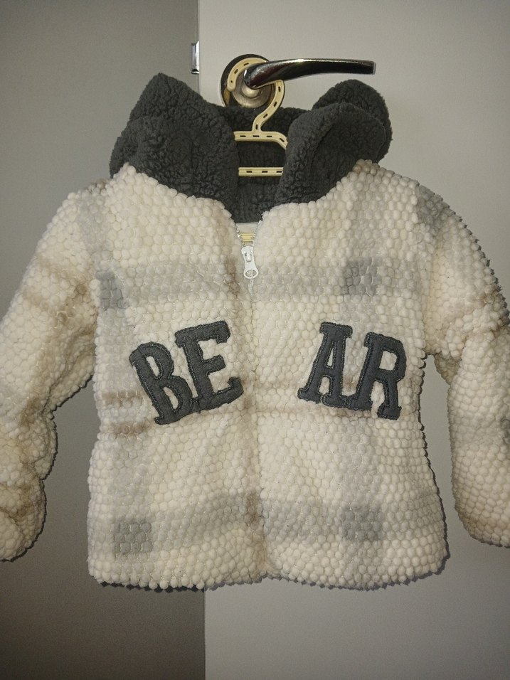 Kapüşonlu, peluş detaylı, beyaz ve gri renklerde, 'BEAR' baskılı, sokak stilinde erkek çocuk ceketi. Rahat ve sıcak tutar.