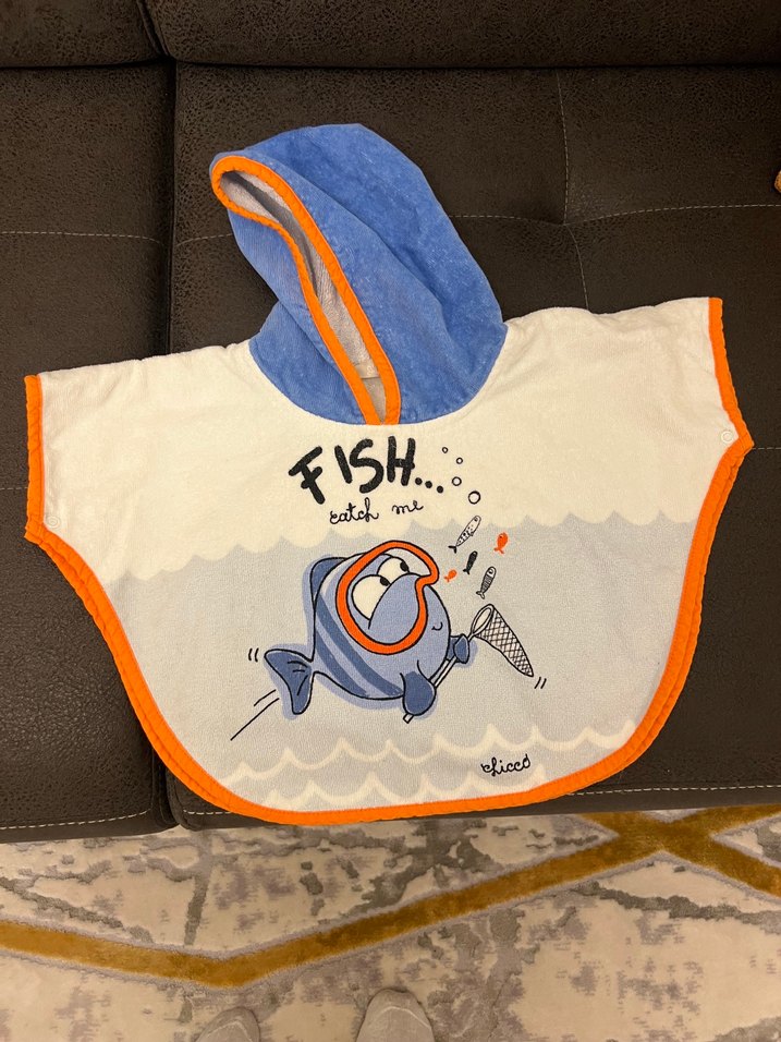 Kapüşonlu ve renkli, balık desenli erkek çocuk bornozu. "FISH... catch me" yazılı, turuncu kenarlıklı, yumuşak dokulu kumaştan üretilmiştir.