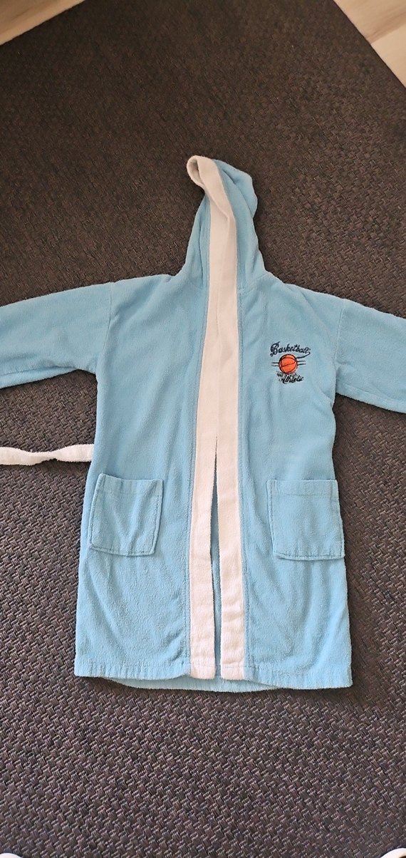 Yumuşak mavi renkli, kapüşonlu erkek çocuk bornozu, basketbol baskılı, ön cepli ve beyaz şerit detaylıdır. Banyo sonrası rahatlık sağlar. Kusaginin sabit olmasi cok kullanislidir. 10_12 yas