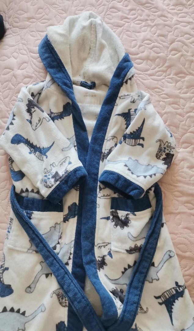 Kapüşonlu, dinazor desenli erkek çocuk bornozu. Yumuşak kumaş, mavi şerit detaylı, cepli ve kuşaklıdır.