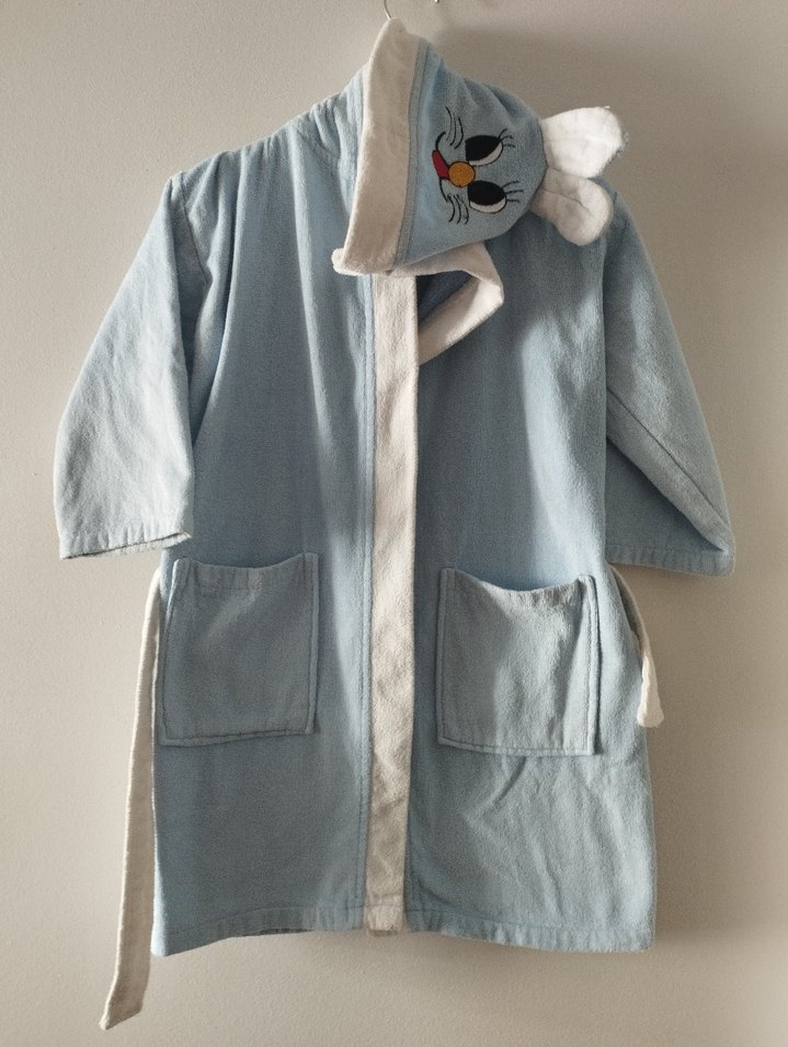 7/9 yaş .Pastel mavi renkte, kapüşonlu ve baskılı hayvan yüzü ile kulaklı erkek çocuk bornozu. İki cepli ve kemerli.