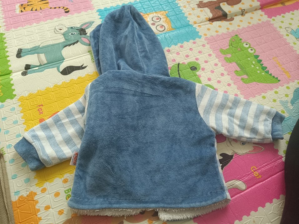 Erkek çocuk bornozu, yumuşak mavi kumaş, kapüşonlu ve çizgili batik desenli kollara sahip. Banyo sonrası konfor ve sıcaklık sağlar.