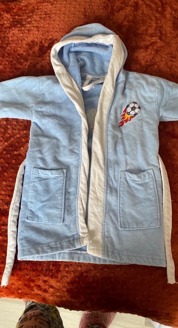 Kapüşonlu, ön cepli, nakışlı futbol topu desenli açık mavi erkek çocuk bornozu. Yumuşak ve rahat kumaştan üretilmiştir. ⚽ 2-4 yaş