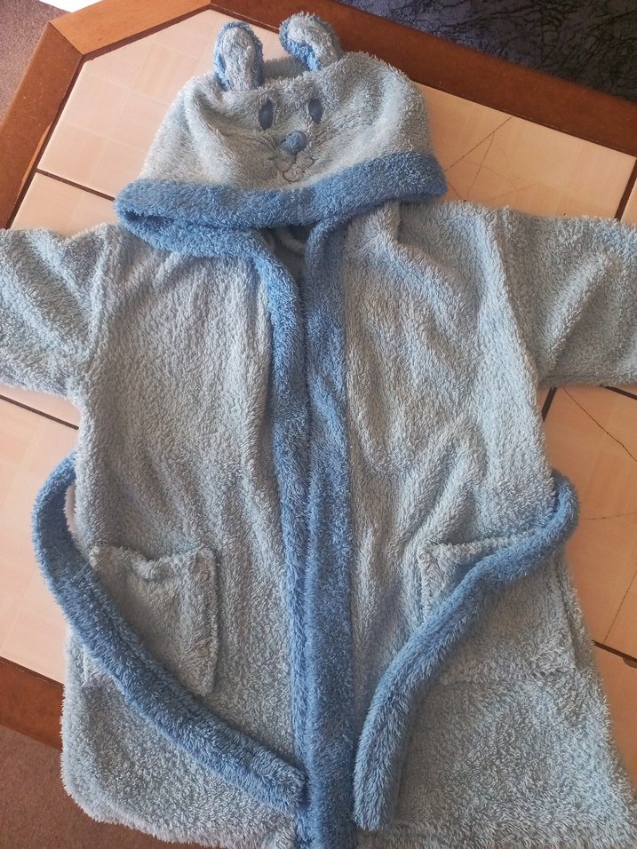 Kapüşonlu, kulak detaylı ve nakışlı yüz desenli mavi erkek çocuk bornozu. Önünde iki cep ve bağlama kemeri bulunur iki üç yaş arası uyumlu.