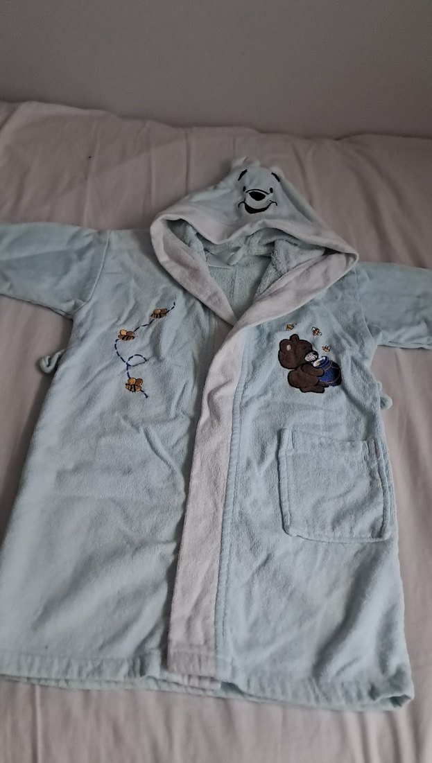 Kapüşonlu, baskılı ve yumuşak kumaştan yapılmış erkek çocuk bornozu, mavi ve gri renklerde, sevimli ayı figürü ile.