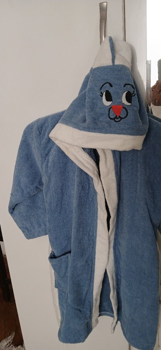 Nakışlı hayvan figürlü kapüşonlu, mavi ve açık gri detaylı, uzun kollu erkek çocuk bornozu. Cepli ve yumuşak kumaştan yapılmıştır.