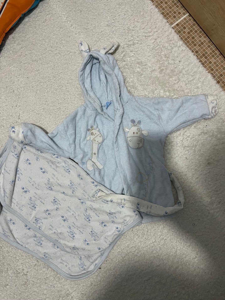 Kapüşonlu ve zürafa desenli baskılı mavi pastel tonlarda erkek çocuk bornozu, uyumlu desenli havlu ile birlikte. Yumuşak ve konforlu kumaş.