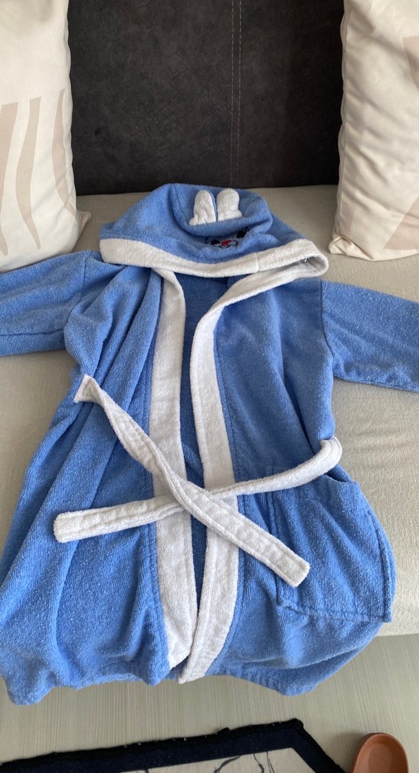 Kapüşonlu, baskılı detaylı mavi erkek çocuk bornozu, yumuşak ve emici kumaştan. Kuşaklı ve gri şerit detaylıdır. 9 10 yaş
