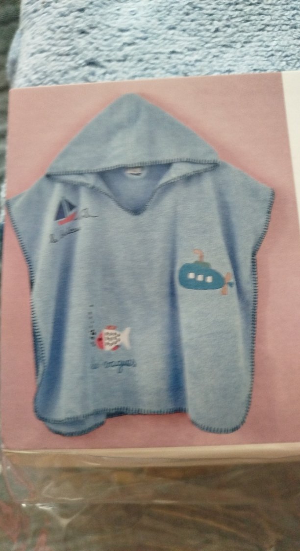 Mavi kapüşonlu erkek çocuk bornozu, yumuşak ve emici kumaştan, eğlenceli baskılı desenlerle.