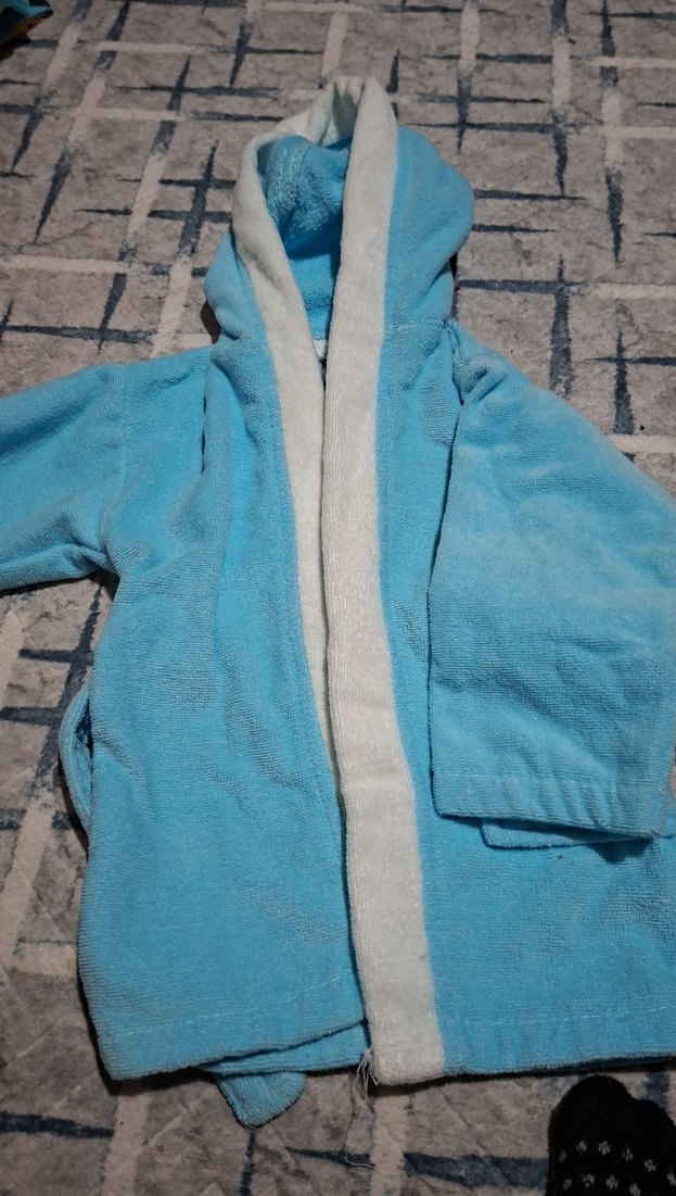 Kapüşonlu, mavi renkli erkek çocuk bornozu, ön kenarlarda gri detaylı, yumuşak dokulu kumaştan yapılmıştır.