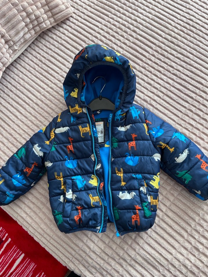 Kapüşonlu, desenli ve kürklü detaylı erkek çocuk montu. Koyu mavi renkli, sıcak ve yumuşak kumaştan, rahat kesimle tasarlanmıştır.