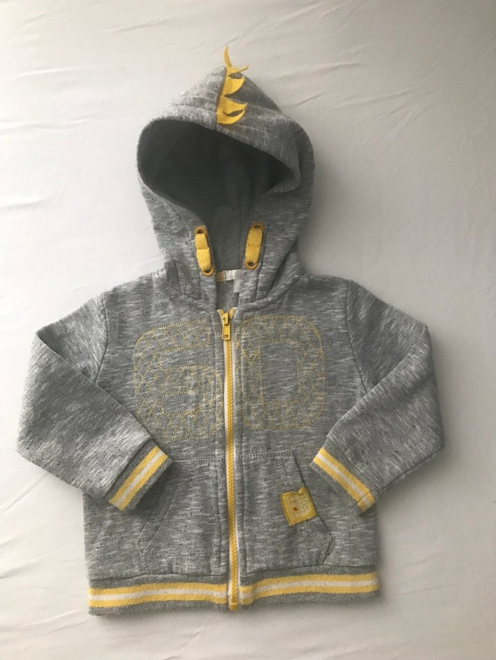 Gri renkli, kapüşonlu, fermuarlı ve uzun kollu erkek çocuk sweatshirtü. Sarı detaylar ve işlemeli desenlerle, yumuşak ve sıcak kumaştan üretilmiştir.