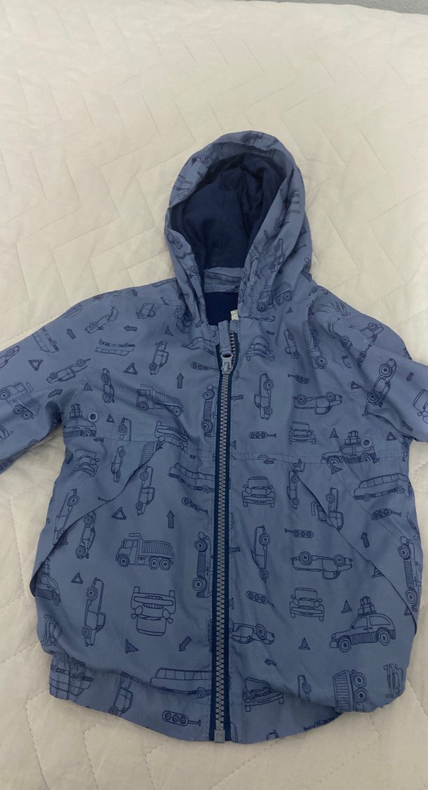 Kapüşonlu, fermuarlı ve rahat kesimli erkek çocuk yağmurluğu, yumuşak ve sıcak kumaştan, mavi ve gri baskılı desenli, günlük sokak stiline uygun.