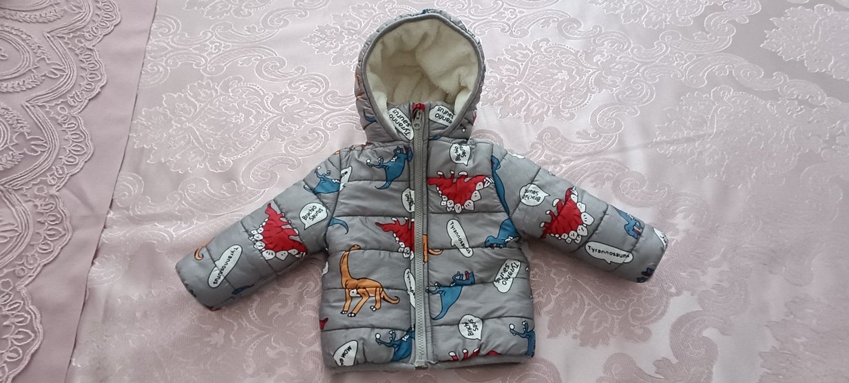 Kapüşonlu, içi yumuşak kürk detaylı, gri renkli ve baskılı desenli, erkek çocuklar için fit kesim mont.