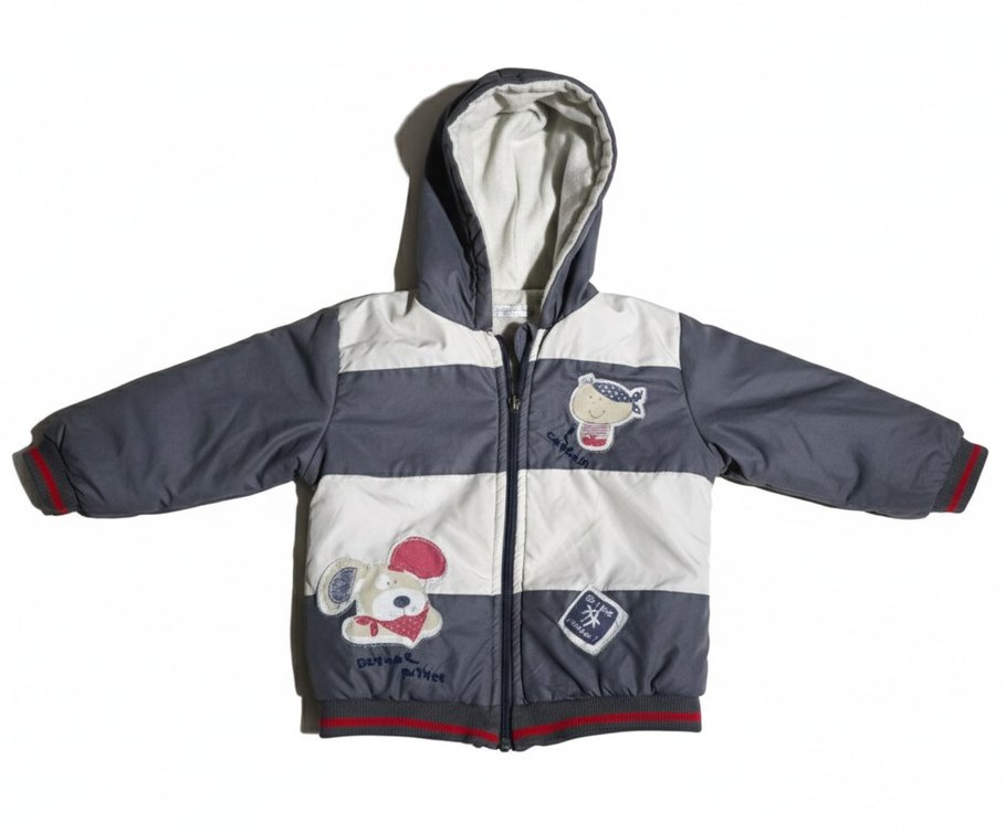 Kapüşonlu, fermuarlı ve fitted kesim erkek çocuk montu. Gri ve beyaz şeritler ile işleme detayları bulunur. Yumuşak ve sıcak kumaştan üretilmiştir.