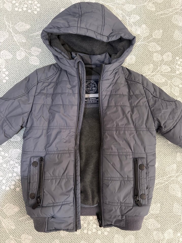 Fermuarlı ve kapüşonlu, yumuşak iç astarlı gri erkek çocuk montu. Sokak tarzına uygun, dar kesim ve desensiz tasarım.