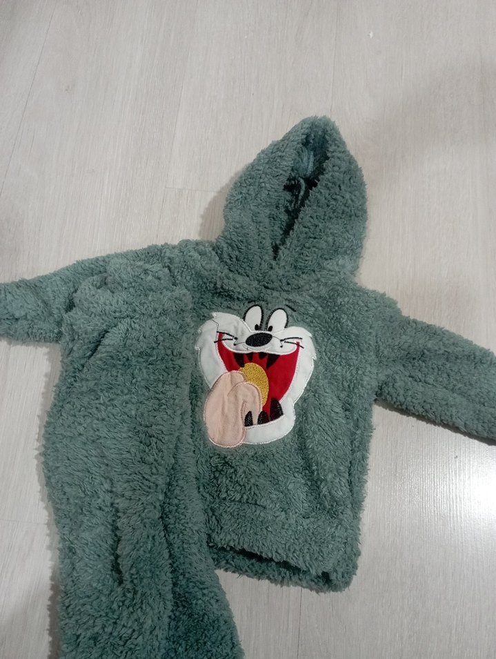 Erkek çocuklar için gri renkli, yumuşak ve peluş kumaştan kapüşonlu, önünde nakışlı çizgi film karakteri bulunan bornoz.