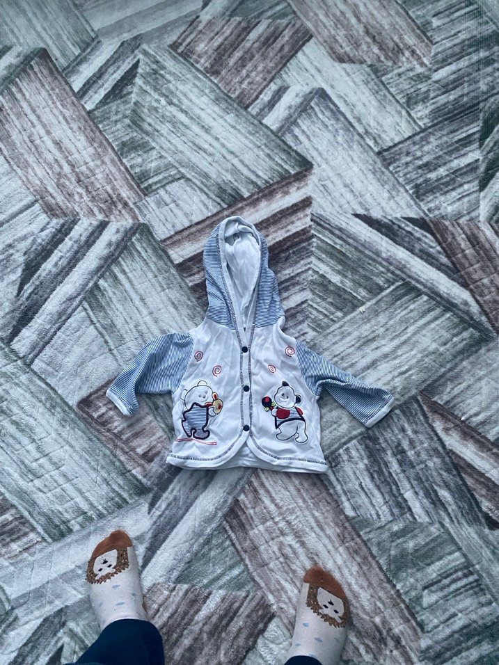 Gri renk, kapüşonlu ve düğmeli erkek çocuk ceketi. Nakışlı desenlerle süslenmiş, rahat kesimli ve sıcak tutan kumaştan yapılmıştır.