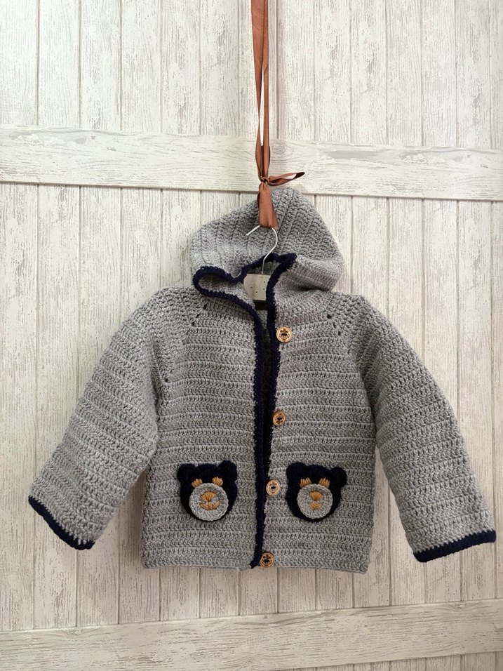 Gri renkli, kapüşonlu ve düğmeli erkek çocuk örgü hırka, uzun kollu ve bol kesimdir. Nakışlı ayı desenli cepleri vardır.