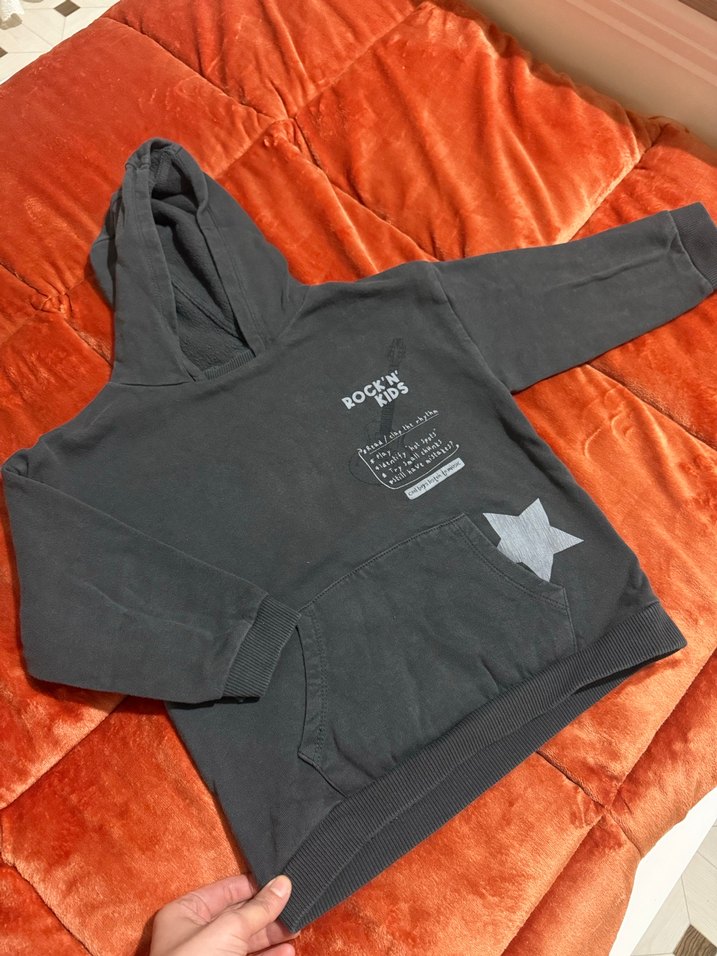 Kapüşonlu, uzun kollu, bol kesim gri sweatshirt. Rock punk tarzı baskılı ve fermuarlı cepli.