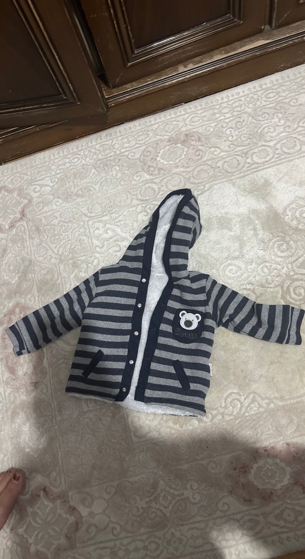 Kapüşonlu, gri zebra desenli, içi tüylü, dar kesim erkek çocuk ceketi. İki cep ve sevimli ayı detaylıdır.