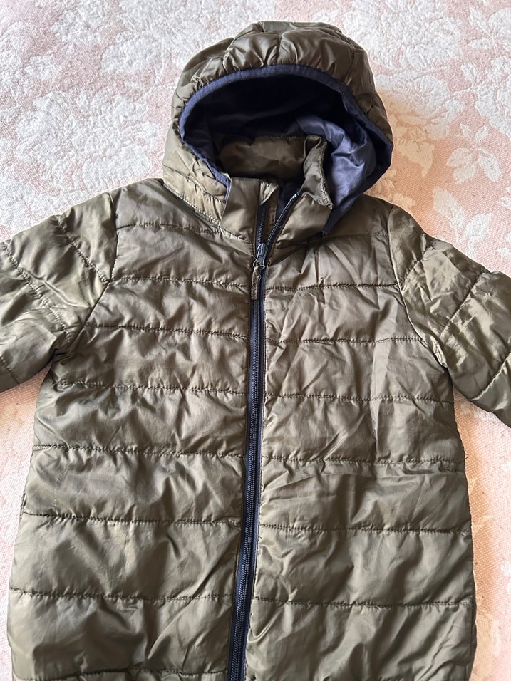 Kapüşonlu, fermuarlı ve dar kesim erkek çocuk montu. Düz haki renkte, suni kumaştan, sokak stili için uygundur.