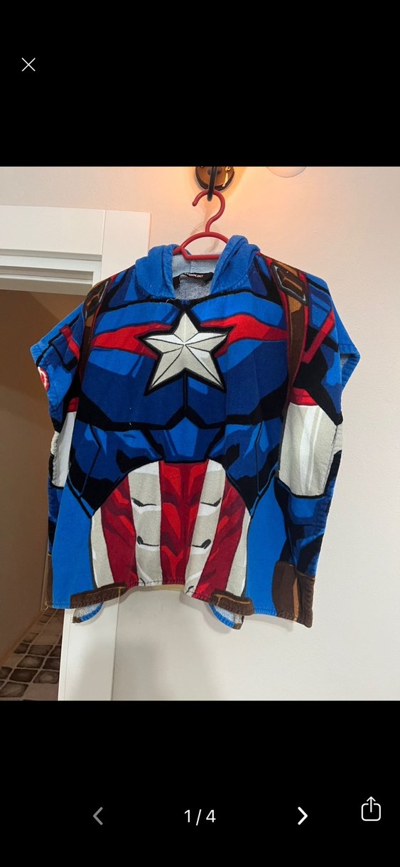 Kapüşonlu, baskılı ve yumuşak emici kumaştan yapılmış koyu mavi erkek çocuk bornozu.