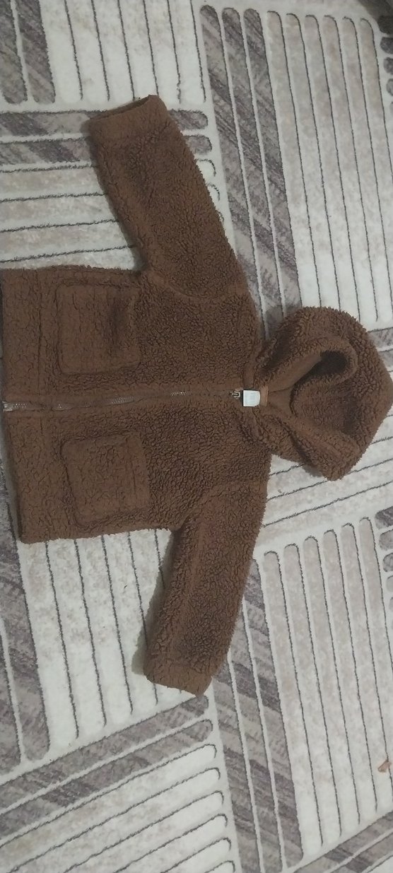 Kapüşonlu, kahverengi, yumuşak ve sıcak kumaştan yapılmış, erkek çocuklar için fitted mont. İki ön cepli, sade örgü tarzda. 3 kere giyildi sıcacık tutuyor
