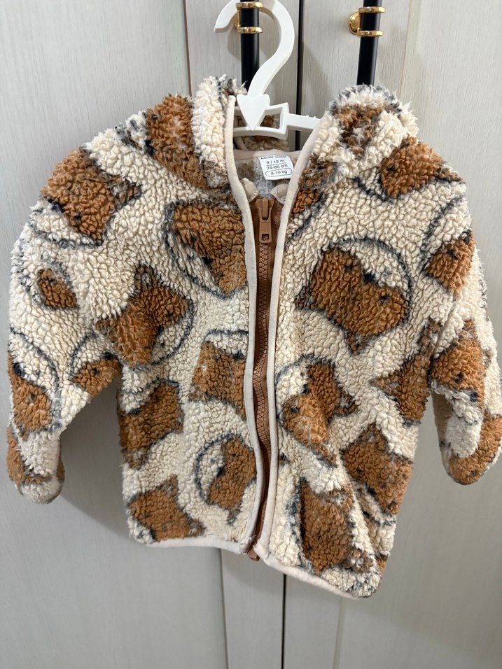 Kapüşonlu, kahverengi ve gri tonlarında, yılan desenli ve kürk detaylı, yumuşak ve sıcak dokulu, fitted kesim erkek çocuk ceketi.