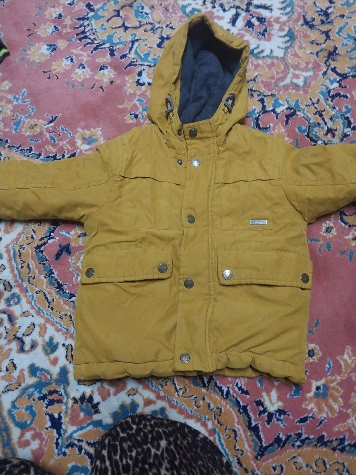 Kapüşonlu ve düğmeli, kahverengi erkek çocuk montu, yumuşak ve sıcak kumaştan, rahat kesim ve günlük kullanım için uygundur.